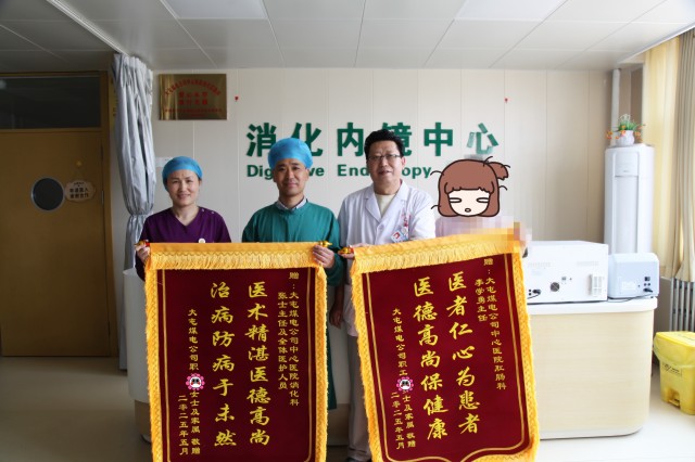 5月28日上午,46歲的張女士踏入大屯煤電公司中心醫院的胃鏡室,親手將兩面熠熠生輝的錦旗分別遞給了李學(xué)勇和張士?jì)晌会t生。她緊緊握住醫生們的手,滿(mǎn)懷感激地連聲說(shuō)道:“謝謝!謝謝你們兩位,還有你們的團隊!我真是太幸運了,能遇到你們,在做胃腸鏡檢查時(shí)及時(shí)發(fā)現早期病變,使我及時(shí)做了手術(shù)?!?