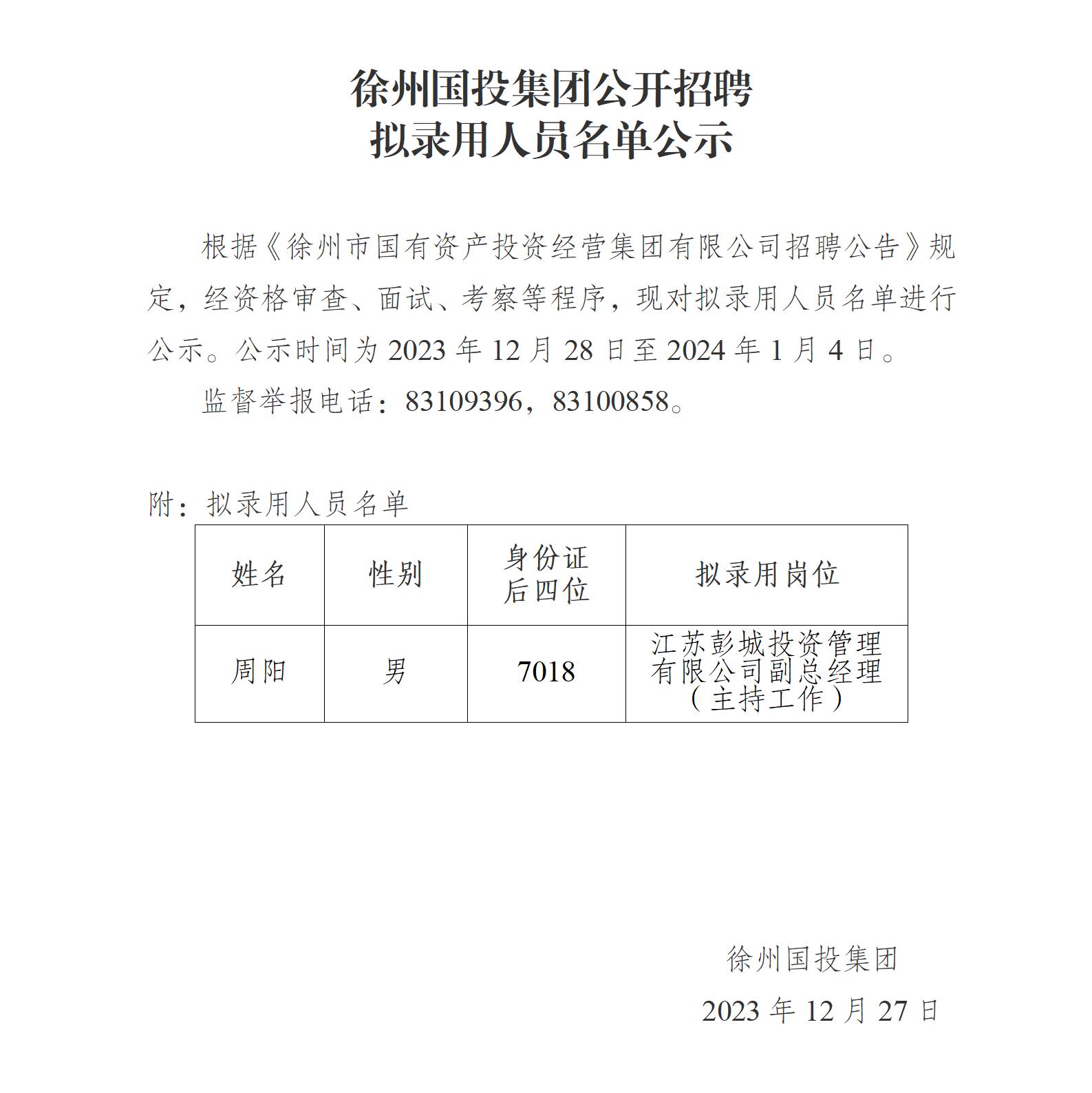 徐州國投集團公開(kāi)招聘擬錄用人員名單公示