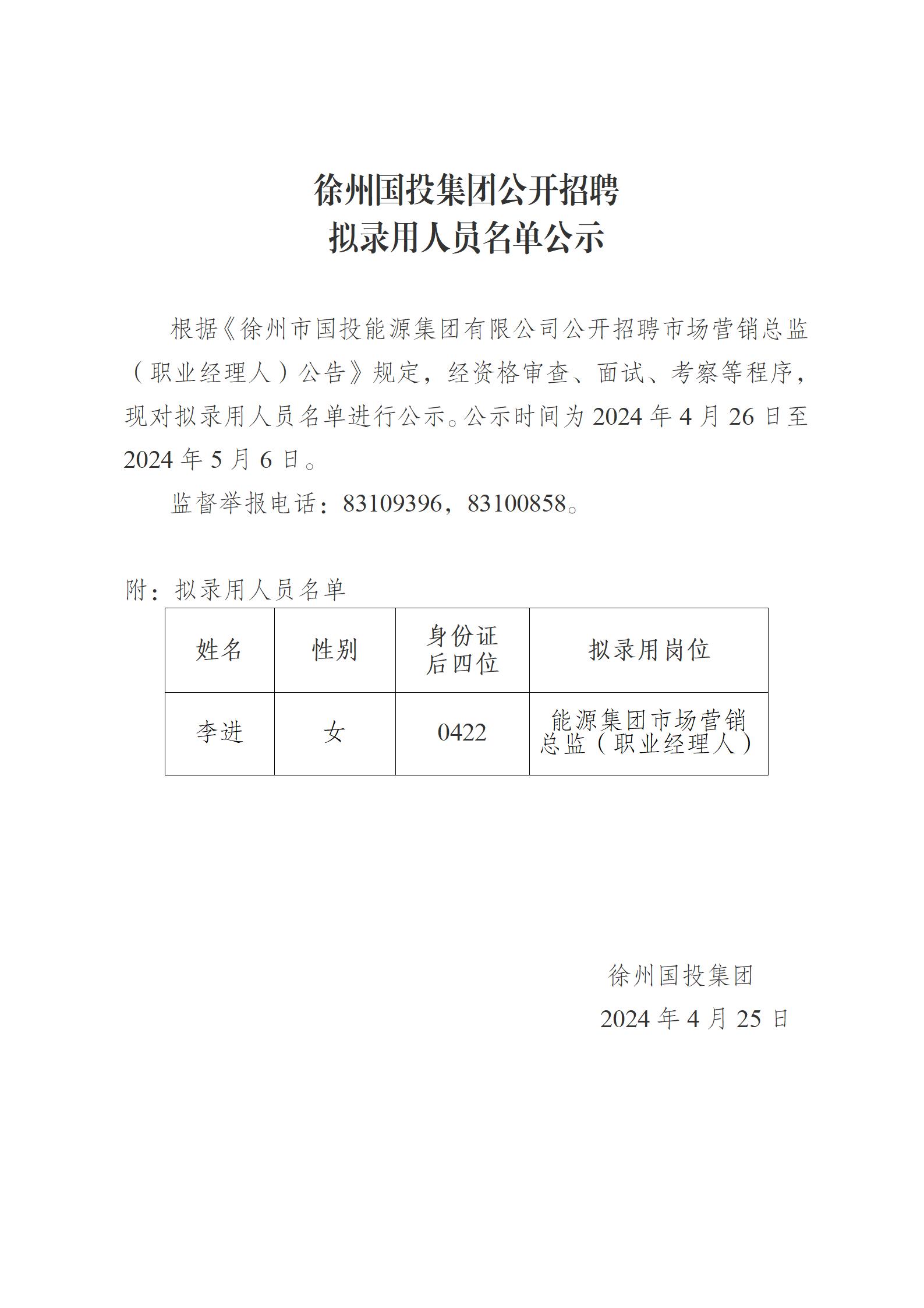 徐州國投集團公開(kāi)招聘擬錄用人員名單公示