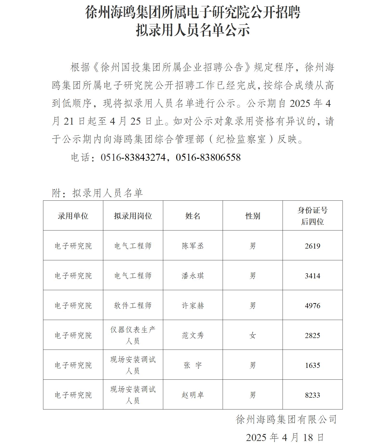 徐州海鷗集團所屬電子研究院公開(kāi)招聘擬錄用人員名單公示