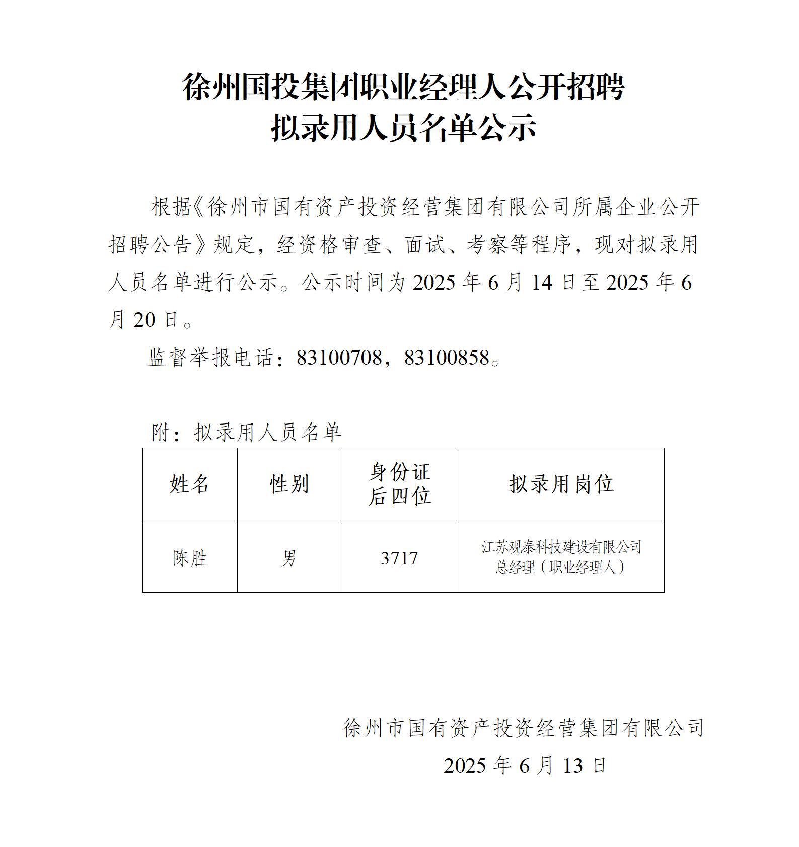 徐州國投集團職業(yè)經(jīng)理人公開(kāi)招聘擬錄用人員名單公示