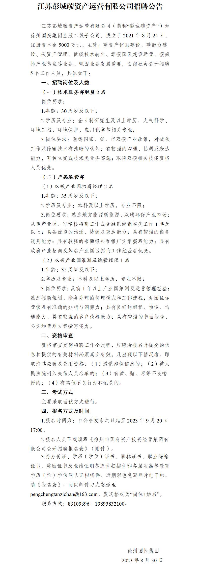 江蘇彭城碳資產(chǎn)運營(yíng)有限公司招聘公告