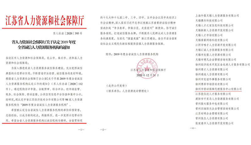 近日,江蘇省人力資源和社會(huì )保障廳公開(kāi)發(fā)布《省人力資源社會(huì )保障廳關(guān)于認定2019年度全省誠信人力資源服務(wù)機構的通知》(蘇人社〔2020〕395號),徐州市勞動(dòng)保障代理服務(wù)中心有限公司榜上有名。江蘇省人社廳于2020年11月在全省范圍內開(kāi)展了“2019年度全省誠信人力資源服務(wù)機構”…