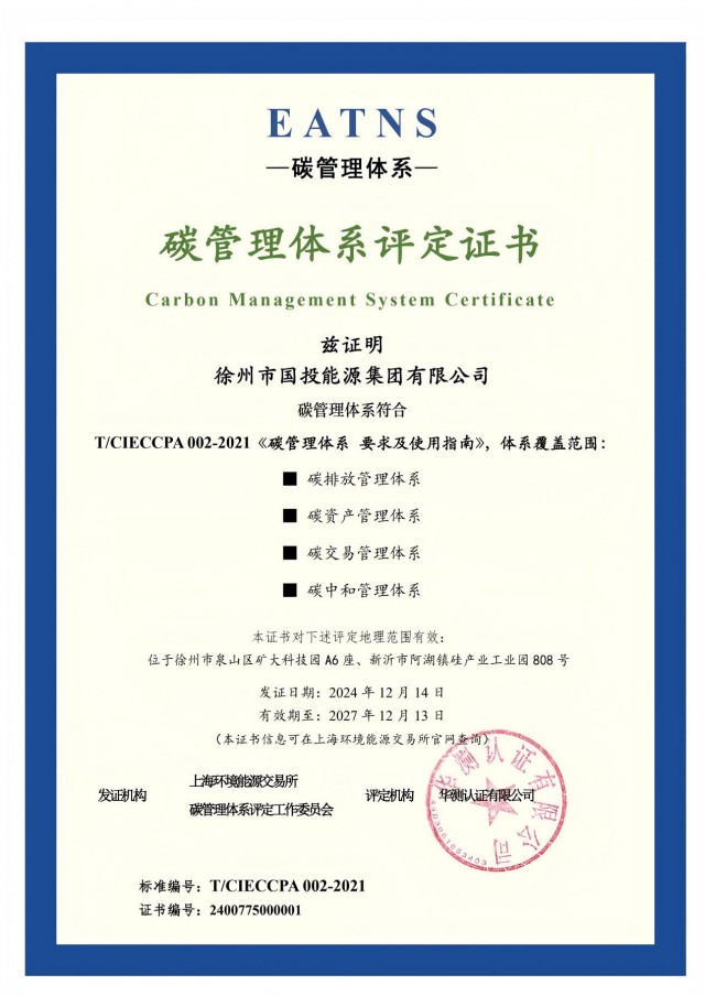 近日,在江蘇彭城碳資產(chǎn)運營(yíng)有限公司的專(zhuān)業(yè)咨詢(xún)協(xié)助下,經(jīng)華測認證有限公司專(zhuān)家組的嚴格評審,能源集團成功通過(guò)碳管理體系認證審核,并獲得由上海環(huán)境能源交易所頒發(fā)的EATNS碳管理體系證書(shū),成為全市率先獲得該體系認證的企業(yè)。同時(shí),碳資信評價(jià)等級實(shí)現AA,標志著(zhù)企業(yè)在“雙碳…