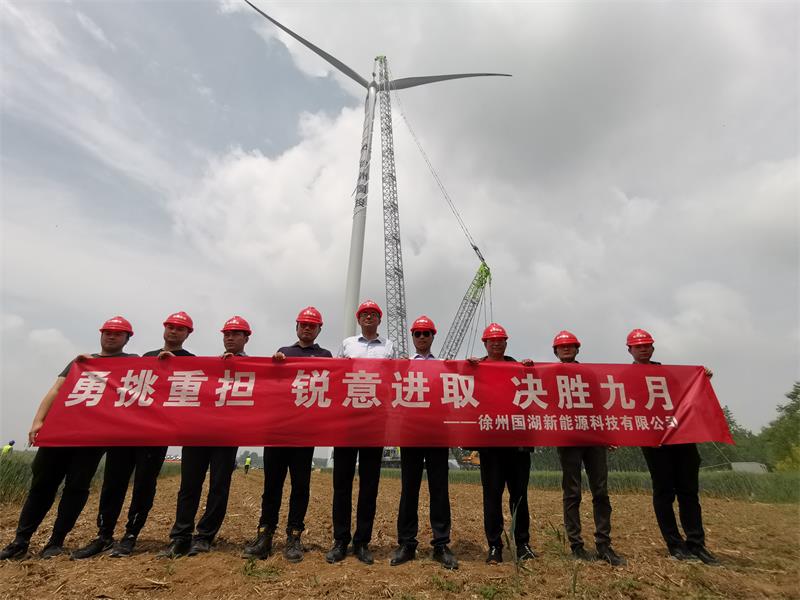在吊裝作業(yè)過(guò)程中,國湖公司及各參建單位通力配合、密切協(xié)作、無(wú)縫對接,全力克服場(chǎng)地空間小、勞動(dòng)強度大、設備運輸難、現場(chǎng)風(fēng)速大等多種困難,嚴格按照風(fēng)機吊裝的規范及工藝要求,有序完成吊車(chē)荷載試驗,塔筒、機艙、葉輪組裝對接工作,經(jīng)專(zhuān)業(yè)力學(xué)驗收,確保各項安全指標合格后,葉輪高空吊裝作業(yè)一次成功。