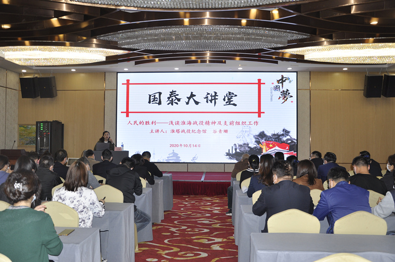 為持續深入開(kāi)展習近平新時(shí)代中國特色社會(huì )主義思想學(xué)習教育,全面落實(shí)《國泰投資公司建設學(xué)習型企業(yè)實(shí)施方案》文件精神,培養企業(yè)核心競爭力,促進(jìn)國泰投資公司轉型發(fā)展。近日,國泰投資開(kāi)展“國泰大講堂”活動(dòng),第一期由機關(guān)黨支部承辦,特邀淮海戰役紀念館谷青珊老師授課。國泰投資本部全體干部職工,各所屬全資、控股公司中層及以上干部參加活動(dòng)。