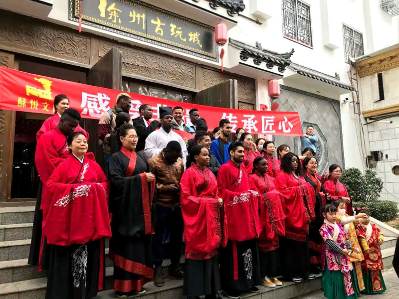 11月15日上午,來(lái)自烏茲別克、津巴布韋、巴基斯坦、哈薩克斯坦、馬里、尼泊爾等國家的江蘇師范大學(xué)留學(xué)生們來(lái)到了國投集團蘇悅文化廣場(chǎng),參加由華強黨總支蘇悅黨支部牽頭舉辦的“感受非遺,傳承匠心”文化推廣活動(dòng)。國家對留學(xué)生的引進(jìn)制定了完備的教育體系,其中一項就是對中國傳統文化的弘揚,讓留學(xué)生走向社會(huì ),增強進(jìn)一步學(xué)習和領(lǐng)會(huì )中國文化的魅力。留學(xué)生們在蘇悅文化公司工作人員的帶領(lǐng)下,穿著(zhù)各色傳統漢服全面的參觀(guān)了徐州古玩城市場(chǎng)。中國漢服非遺研究員李洪蓮、李博老師系統地講解了中國傳統服飾——漢服的歷史和演變,并親自指導留學(xué)生們著(zhù)漢服走秀、行禮,吸引了眾多路人的駐足。