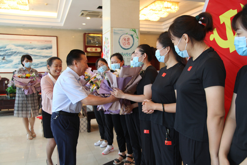 27日早上8點(diǎn),12名抗疫隊員們穿著(zhù)貼有國旗標識的統一服裝,高舉著(zhù)鮮紅的黨旗,懷著(zhù)激動(dòng)的心情列隊等候在大廳,李曉東董事長(cháng)、姜巖總經(jīng)理與她們一一親切握手、問(wèn)候,親手送上鮮花與禮盒,并與她們合影留念。