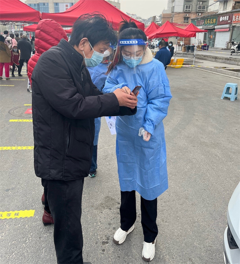 “孩子,謝謝你啊,辛苦了”子房山社區的爺爺奶奶們對王雪斐說(shuō)道。王雪斐是國泰公司一名90后青年,第一次去子房山社區做核酸檢測時(shí),她發(fā)現社區里面老年人比較多,因為不會(huì )用兩碼造成檢測效率低,老年人排隊時(shí)間久,急需一個(gè)能夠主動(dòng)幫助老年人的志愿者。她打定主意后,聯(lián)系社區加入了戰疫工作,在完成發(fā)放防疫物資、出入證件、維持隊伍秩序、登記居民信息的基礎工作間隙,她還主動(dòng)幫助爺爺奶奶們打開(kāi)兩碼、耐心的告知核酸檢測時(shí)間和注意事項。一天下來(lái),忙前忙后,她卻滿(mǎn)不在乎地說(shuō)道:“不要緊,疫情就是命令,為了人民的利益,為了戰疫的勝利,我們青年人就是戰疫的一塊磚,哪里需要哪里搬?!?