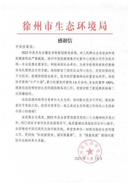 市生態(tài)環(huán)境局對集團公司的感謝信中寫(xiě)道:“2022年我市先后爆發(fā)多輪新冠肺炎疫情,對人民群眾生命安全和身體健康構成嚴重威脅。徐州市危險廢物集中處置中心有限公司作為我市唯一專(zhuān)業(yè)醫廢處置單位,積極承擔社會(huì )責任,為我市疫情防控醫療廢物安全處置做出應有貢獻,深刻彰顯了國有企業(yè)同心協(xié)力、共克時(shí)艱的實(shí)干與擔當。疫情防控阻擊戰中,我市醫療廢物轉運處置安全有序,涉疫醫療廢物‘日產(chǎn)日清’,累計處置醫療廢物1.6萬(wàn)余噸,安全處置率100%,圓滿(mǎn)完成疫情防控生態(tài)環(huán)境保障各項工作,有效切斷了新冠肺炎病毒二次傳播途徑?!?