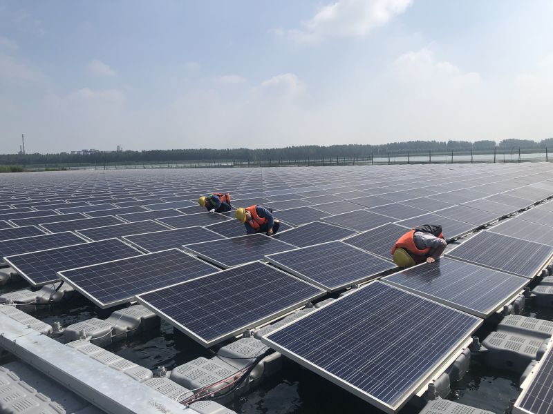 熱浪翻滾,淮北鑫能電站運維人員正小心翼翼的在浮筒上穿行,檢查光伏組件MC4接頭是否有脫落。狹窄的浮筒通道上,他們或趴或坐在浮筒上,對破損的電纜通道浮筒和故障逆變器進(jìn)行更換。經(jīng)過(guò)猛烈的日光折射,水面上形成了一股熱氣,上烤下蒸的模式使得救生衣里面衣衫濕透,分不清是汗水還是湖水。