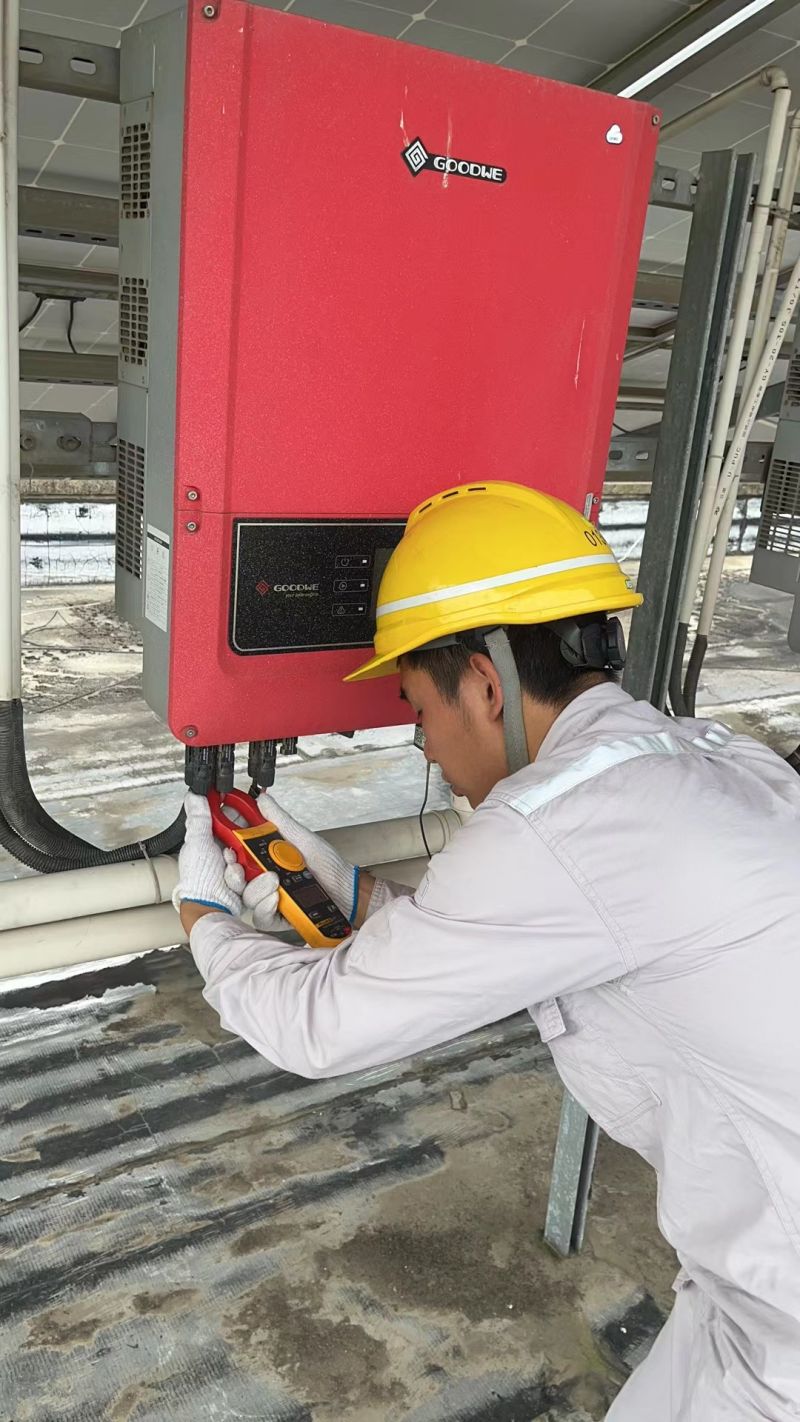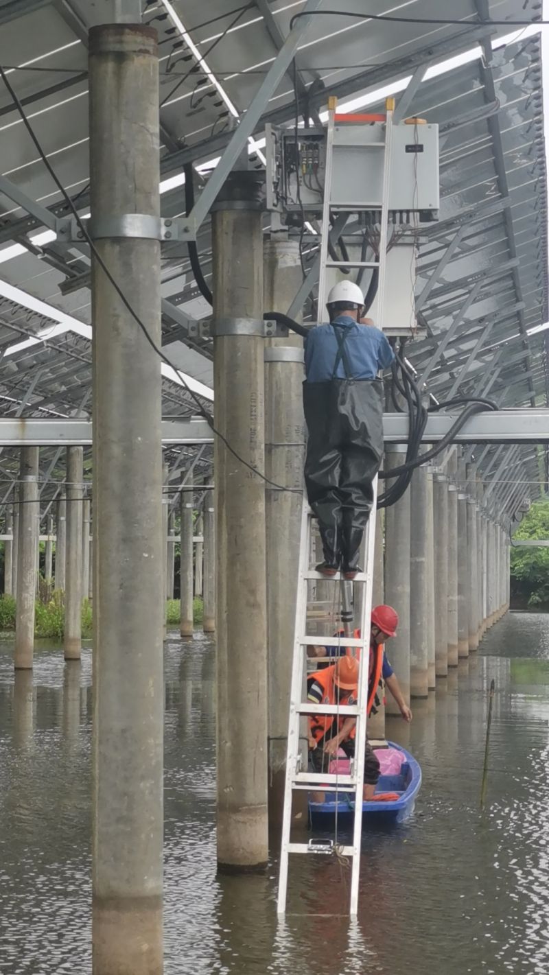 太湖鑫能電站的光伏組件和逆變器安裝在距水面高度3米的支架上,日常運維借助梯子和小船進(jìn)行,一旦發(fā)現逆變器故障,運維人員只能腳踩淤泥站在齊腰深的水中,為高處作業(yè)的同伴扶穩梯子,以便完成故障逆變器的更換。