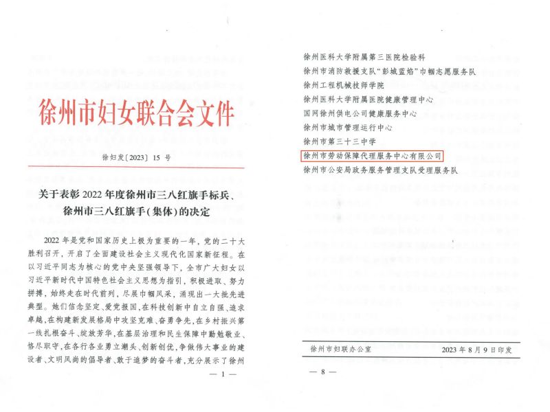近日,徐州市婦女聯(lián)合會(huì )印發(fā)《關(guān)于表彰2022年度徐州市三八紅旗標兵、徐州市三八紅旗手(集體)的決定》(徐婦發(fā)〔2023〕15號),徐州國投集團所屬徐州市勞動(dòng)保障代理服務(wù)中心有限公司(以下簡(jiǎn)稱(chēng)“勞代公司”)被授予“徐州市三八紅旗集體”榮譽(yù)稱(chēng)號。