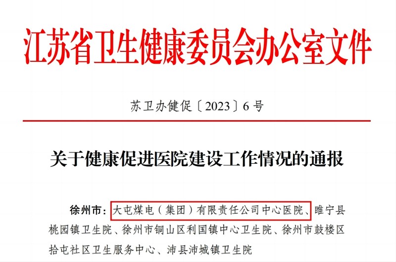 喜報!近日,在江蘇省衛生健康委員會(huì )發(fā)布的《關(guān)于健康促進(jìn)醫院建設工作情況的通報》中,大屯煤電公司中心醫院順利通過(guò)江蘇省健康促進(jìn)醫院評審,被確定為江蘇省健康促進(jìn)醫院,并位居本次徐州市獲評省級健康促進(jìn)醫院榜首。