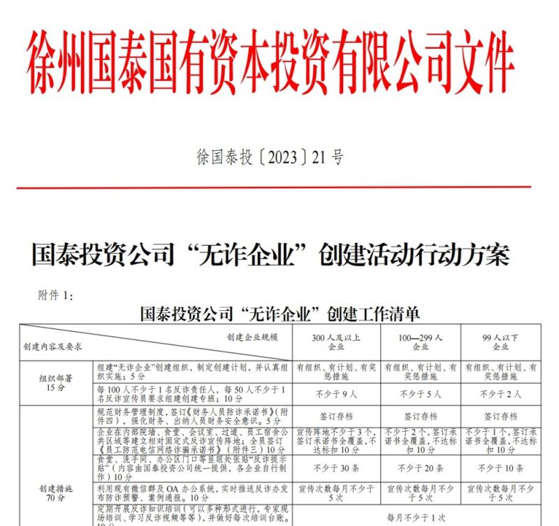 為順利推進(jìn)“無(wú)詐企業(yè)”創(chuàng )建工作,國泰投資公司成立“無(wú)詐企業(yè)”創(chuàng )建工作領(lǐng)導小組,制定《“無(wú)詐企業(yè)”創(chuàng )建工作清單》,強調要加強防范電信網(wǎng)絡(luò )詐騙學(xué)習、加強內外部反詐宣傳以及運用科學(xué)技術(shù)加強保障等方面的工作,樹(shù)立保護職工“錢(qián)袋子”就是促進(jìn)企業(yè)安全生產(chǎn)、健康發(fā)展理念,共同努力打造“無(wú)詐企業(yè)”良好形象。