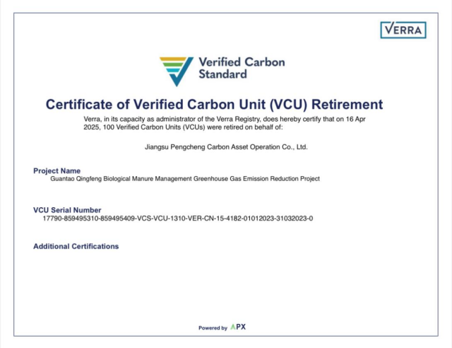 江蘇彭城碳資產(chǎn)運營(yíng)有限公司已通過(guò)購買(mǎi)國際自愿減排(VCS):館陶縣慶豐生物科技有限公司糞便管理溫室氣體減排項目,用于活動(dòng)能耗和包括參會(huì )者們在活動(dòng)中產(chǎn)生的二氧化碳當量溫室氣體排放,實(shí)現活動(dòng)碳中和。
