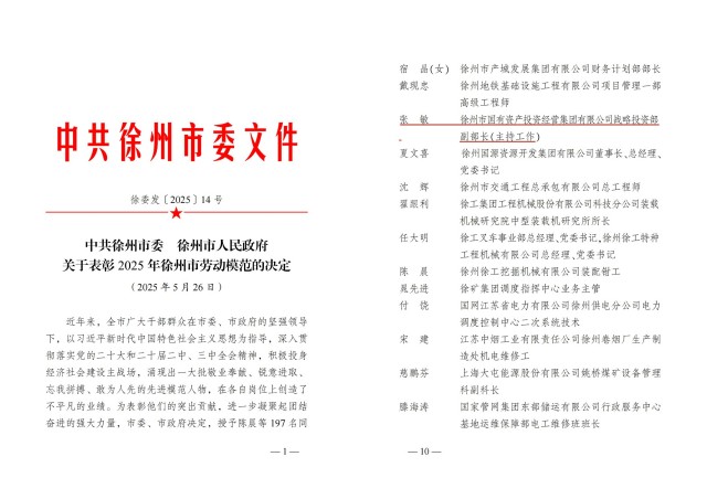 2025年5月28日,徐州市勞動(dòng)模范表彰大會(huì )召開(kāi),徐州國投集團戰略投資部副部長(cháng)(主持工作)張敏榮獲“徐州市勞動(dòng)模范”稱(chēng)號!