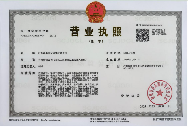 江蘇觀(guān)泰建設科技有限公司(以下簡(jiǎn)稱(chēng)“觀(guān)泰公司”)是作為徐州市屬?lài)笾攸c(diǎn)培育的現代建設服務(wù)商,成立于2020年11月,注冊資本5000萬(wàn)元,隸屬于徐州市國有資產(chǎn)投資經(jīng)營(yíng)集團,是徐州市環(huán)投能源科技有限公司的全資子公司。公司立足“科技賦能、品質(zhì)筑基”發(fā)展理念,持有建筑工程、市政公用工程施工總承包三級、機電工程等多項專(zhuān)業(yè)資質(zhì),致力于為客戶(hù)創(chuàng )造顯著(zhù)的經(jīng)濟和社會(huì )效益,并得到了客戶(hù)的高度認可,現已形成覆蓋房建、市政、機電、智能化工程的全產(chǎn)業(yè)鏈服務(wù)能力。