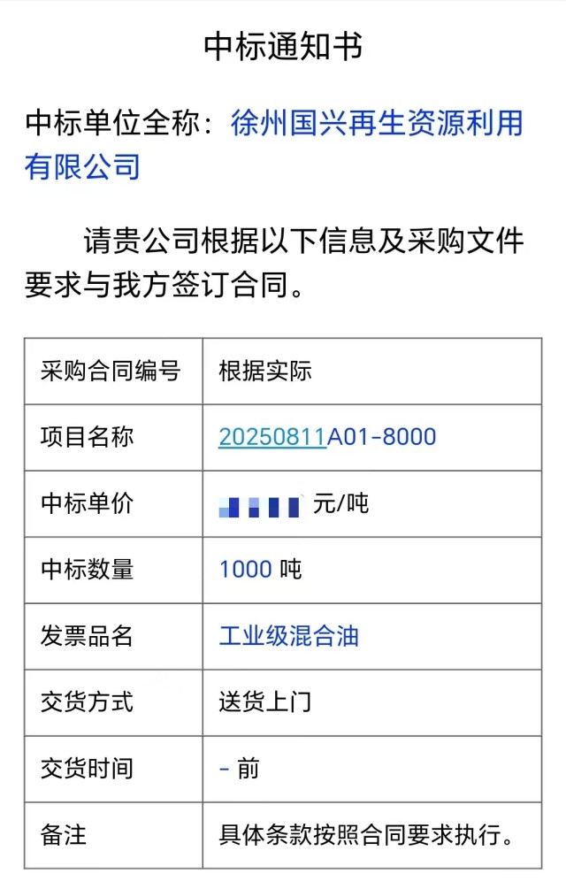 8月12日,徐州國興再生資源利用有限公司迎來(lái)重大突破——成功中標連云港嘉澳新能源有限公司1000噸工業(yè)級混合油(UCO)采購項目(中標編號:20250811A01-8000)。這是國興公司首次實(shí)現千噸級工業(yè)級混合油貿易,標志著(zhù)集團公司在生物質(zhì)能源領(lǐng)域的市場(chǎng)開(kāi)辟新道路,也為企業(yè)建立零碳工廠(chǎng)邁出堅實(shí)的一步。