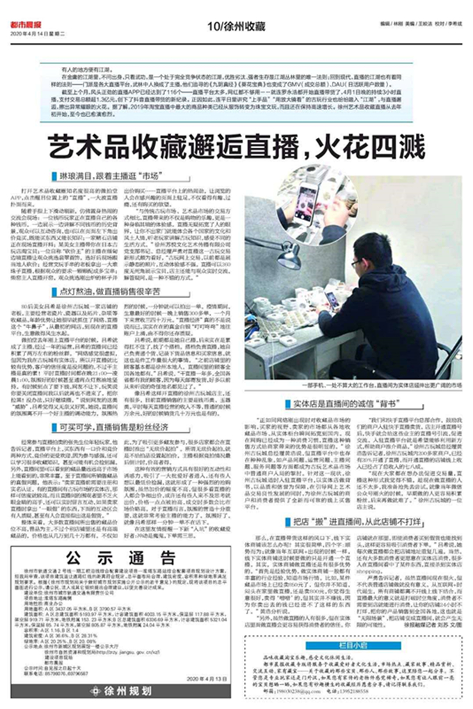 華強資產(chǎn)公司所屬的蘇悅文化公司直播基地自推廣以來(lái),在徐州文化圈內引起了強烈共鳴,都市晨報文化專(zhuān)欄記者知悉后,主動(dòng)聯(lián)系蘇悅公司進(jìn)行了采訪(fǎng),并與2020年4月14日(周二),對此進(jìn)行了整版報道。